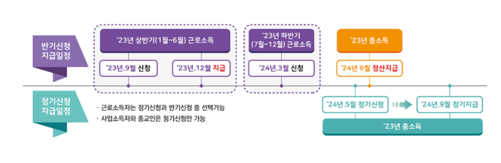 2024년 정기 근로.자녀 장려금은 2023년에 근로∙사업∙종교인 등 소득이 있는 가구가 대상입니다.