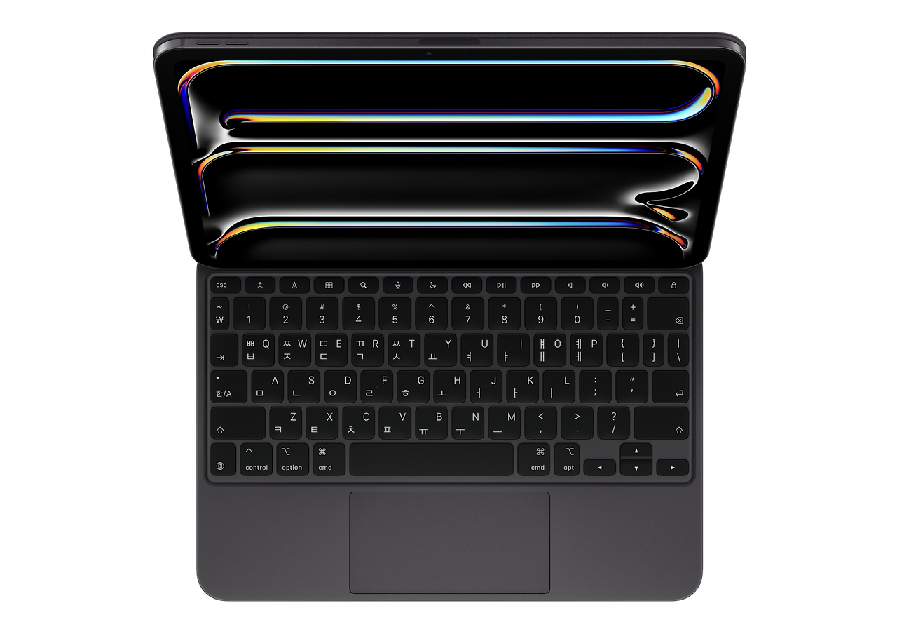 아이패드 프로 7세대는 얇고 가벼운 디자인의 새로움 매직키보드가 적용되었습니다. 플로팅 디자인임을 알 수 있으며 화면 밝기, 음량 제어 등 다양한 기능키 열을 상단에 적용하여 컨트롤적인 개선을 보여줬습니다. 또한 알루미늄 팜레스트와 확장된 크기에 햅틱 피드백으로 맥북 같은 사용성을 경험할 수 있도록 하였습니다.