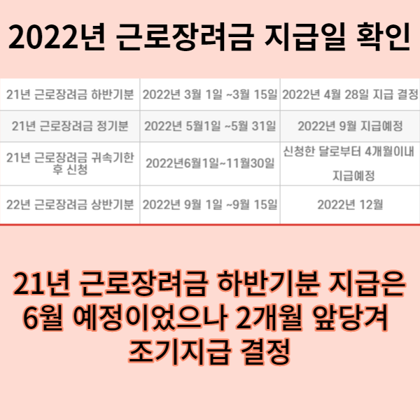 국세청은 2021년 반기분 근로장려금 지급 날짜를 6월 예정이었으나 , 코로나로 힘든 가정에 조금이나마 보탬이 되고자 2개월 앞당겨 조기지급하겠다고 하여 4월 28일에 지급이 될 예정이라고 합니다.