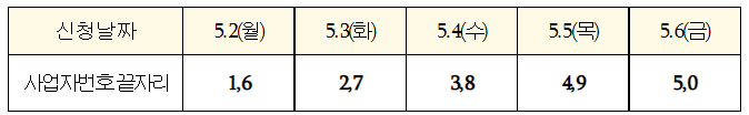 - 5부제 시행 : 5월 2일 (월)~ 5월 6일 (금) / 사업자 번호 끝자리 기준 5부제