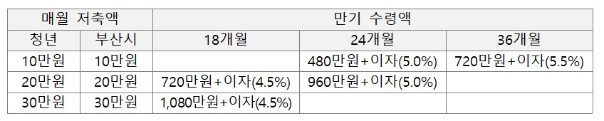 예를 들면 10만원을 24개월을 넣으면 240만원 (청년) + 240만원(부산시) =480만원 + 이자 5% 가 들어갑니다.