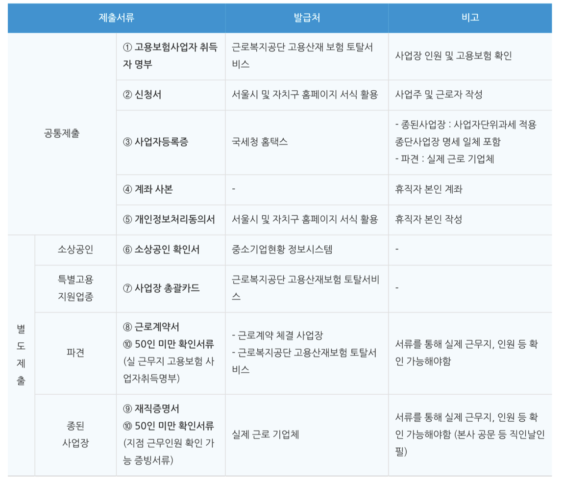 - 평일은 신청자가 신청서와 증빙서류를 구비, 기업체의 주소지가 있는 관할 자치구에 제출하거나 주말에는 이메일,우편, 팩스 등으로 접수 할 수 있습니다. 접수는 본인이 아니어도 기업주, 근로자, 제 3자 (위임장 첨부시 ) 도 신청할 수 있습니다.