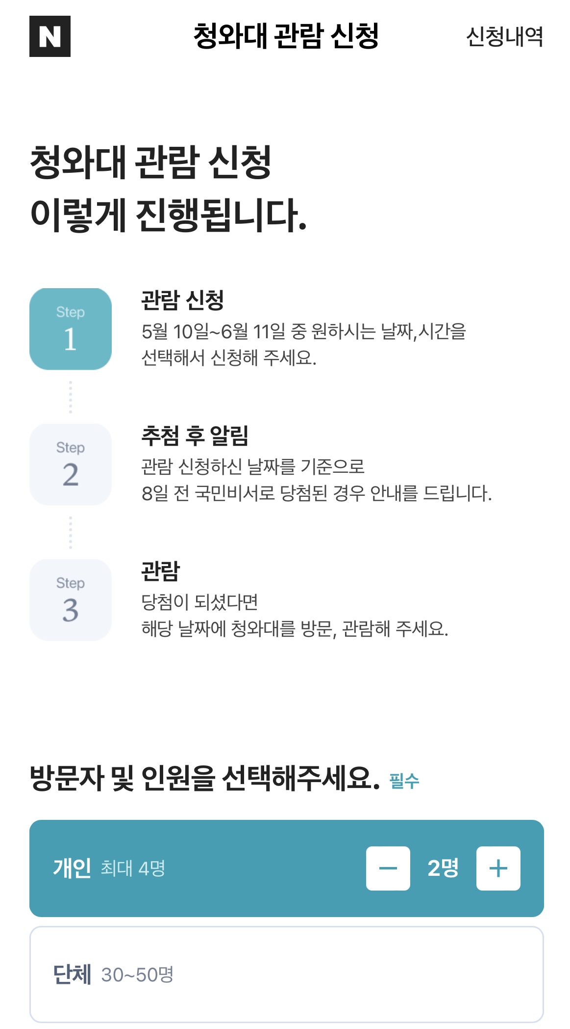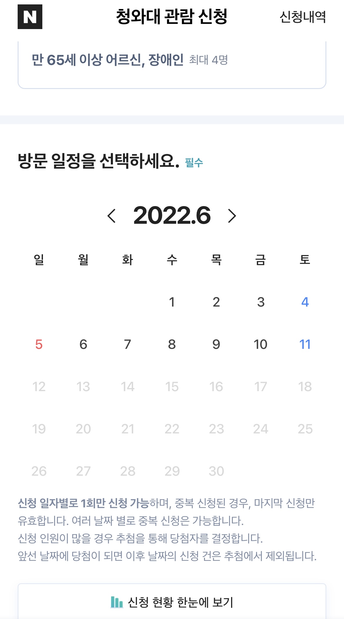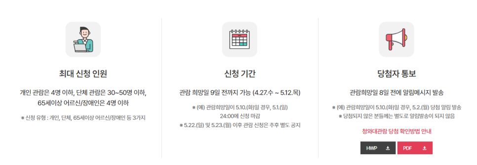 (예) 관람희망일이 5.10(화) 인경우 , 5.1(일) 24:00에 신청 마감 - 최대 신청 인원 : 개인 관람은 4명이하, 단체 관람은 30~50명 이하, 65세 이하어르신/장애인 4명이하