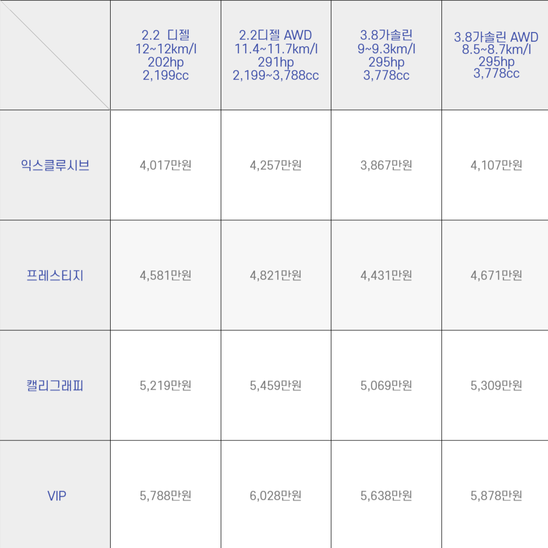 가격 인상폭은 (개별소비세 3.5% 적용시 ) 인상폭은 200만원~400만원 수준입니다.