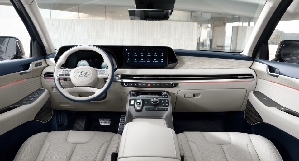 일체형 구조로 실내가 더욱 넓어보이고 더욱 고급스러워진 느낌입니다. 디스플레이와 버튼식 기어 시프트 등은 이전 구형 팰리세이드와 다를 바 없지만 아날로그 버튼이 사라진 터치형 공조제어 장치가 새로 추가되어 덕분이기도 합니다.