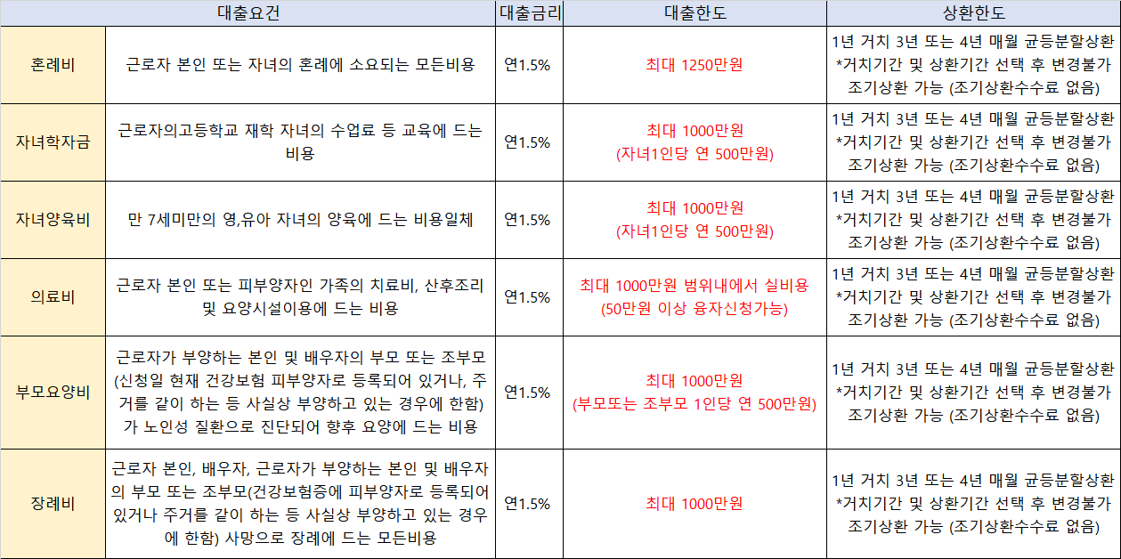 예기치 못했던 급한 일로 목돈이 갑자기 들어가는 일이 생기고는 합니다. 결혼,장례를 비롯하여 의료비 ,자녀 학자금, 자녀 양육비, 부모님 부양비까지 갑자기 목돈이 들어갈 일이 생겼는데 돈이 없다면 고금리 대출을 받을 수 밖에 없겠죠. 고금리 대출은 근로자 가정경제에 큰 타격을 줄 수 밖에 없으니, 가능하면 낮은 금리의 대출을 이용할 수 있다면 낮은 금리의 대출상품을 이용하는 것이 좋습니다.