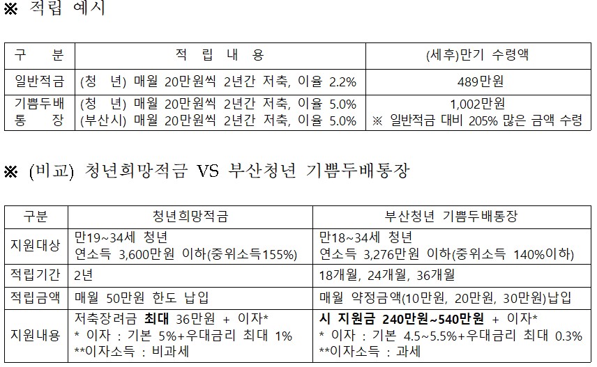 - 신청방법 : 신청기간 내에 부산청년 기쁨 누리집 또는 , 부산 청년 플랫폼을 통해 온라인으로만 가능하며 지난 2월에 출시된 청년희망적금에 가입된 청년도 신청할 수 있습니다.