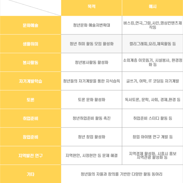 • 시흥시 거주(재직,재학포함) , 만 19~34세 청년 동아리