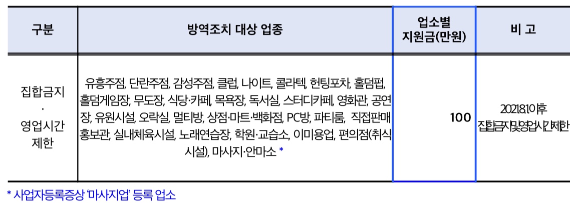 - 방역조치 : 집합 금지 및 영업제한 행정명령 이행업체
