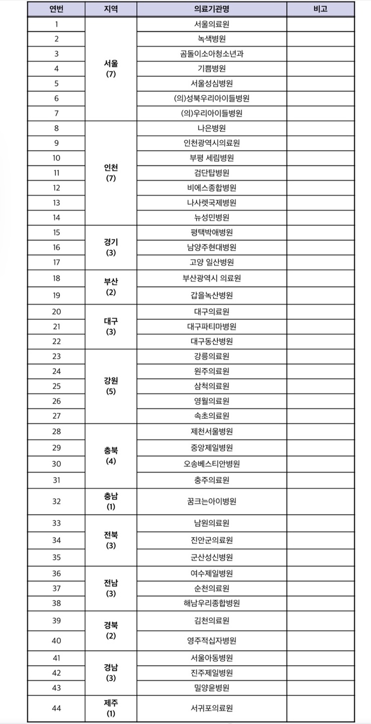 2. 외래진료센터 중 소아 대면진료가능 의료기관(44개소) 명단