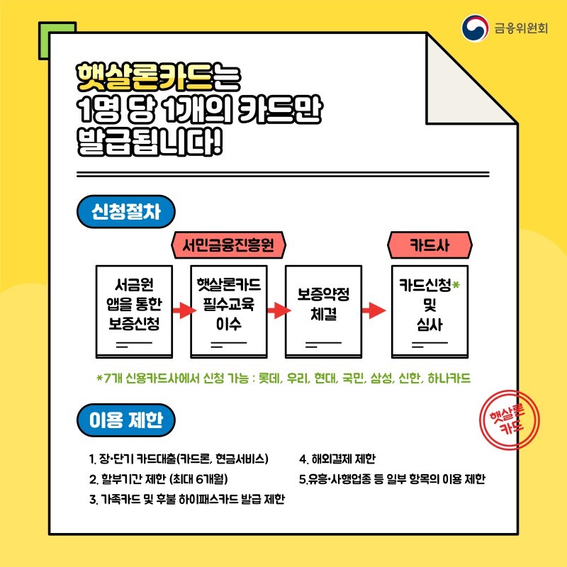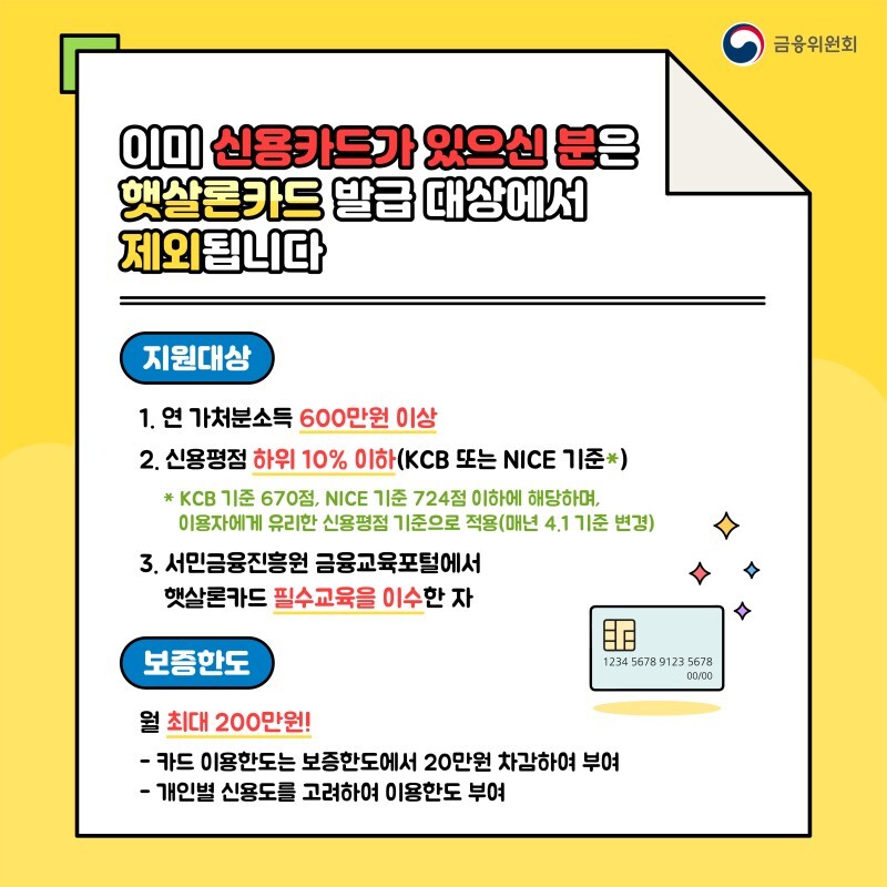 A. 최저 신용자도 상환능력 내에서 신용카드를 발급받을 수 있습니다. 햇살론 카드를 이용해보세요