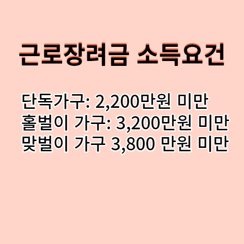 소득요건은 가구 유형에 따라 달라지는데, 단독가구는 2200만원 미만, 홀벌이 가구는 3200만원 미만, 맞벌이 가구는 3800만원 미만이 소득요건 기준이 됩니다. 2022 근로장려금은 기존에 비해 가구별로 200만원씩 상향 조정 되어 지난해 연봉인상이 되었더라도 계속해서 받을 수 있는 가능성이 있어, 더 많은 가구가 혜택을 받을 것으로 예상됩니다.