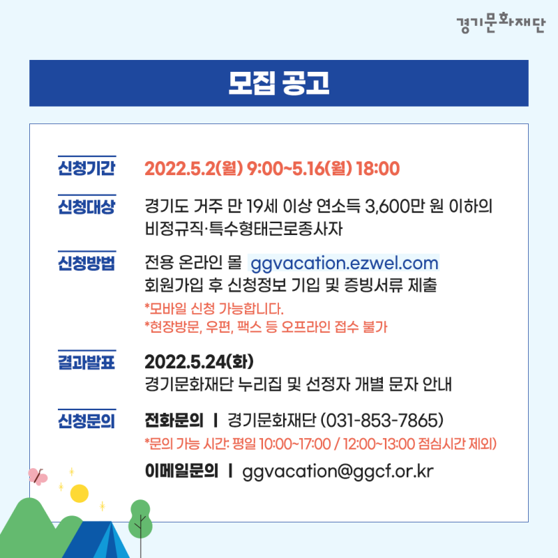 전화문의 : 경기문화재단 (031-853-7865)/ 이메일 문의 : ggvacation@ggcf.or.kr