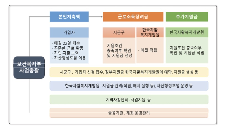 - 신청자가 매월 10만원 이상 저축 + 유예기간 (3년만기후 6월) 이내 탈수급 = 근로소득장려금 1080만원 지원