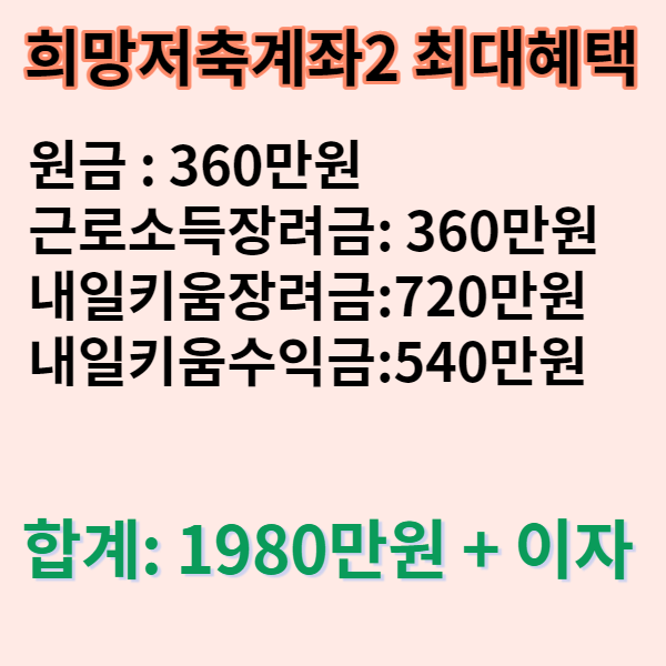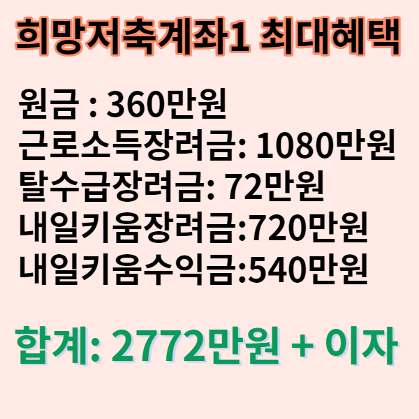 - 본인이 매달 10만 원을 저축하면 근로소득 장려금으로 매달 30만 원이 지급 * 3년 만기 = 360 만원 + 정부지원금 180만원 = 14440만원 + 이자